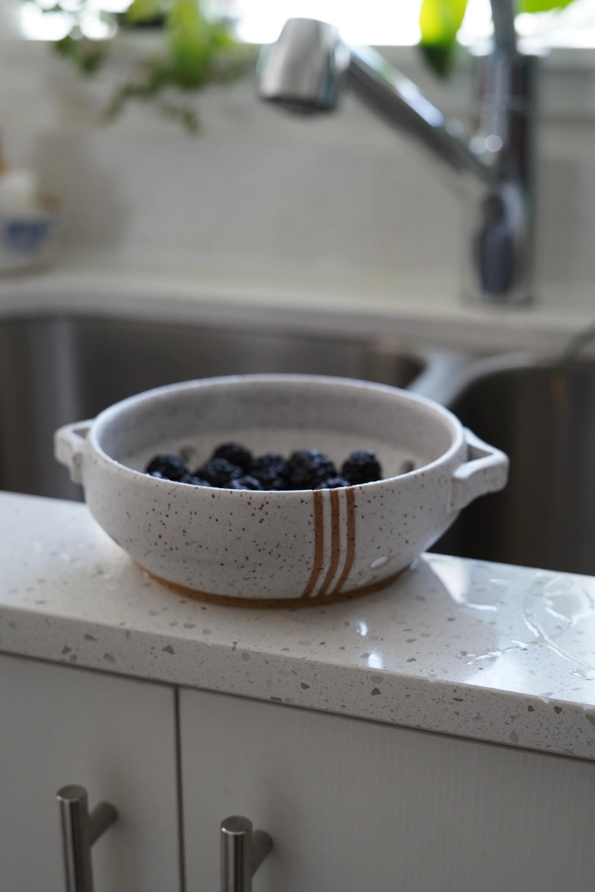 The Abby berry bowl is perfect for any kitchen setup! This piece is made with speckled buff clay and the top surface is covered in a matte white glaze. Three striped lines exposing the raw stoneware underneath are a distinct characteristic of this set. Add this to your home for a classy, earthy vibe.